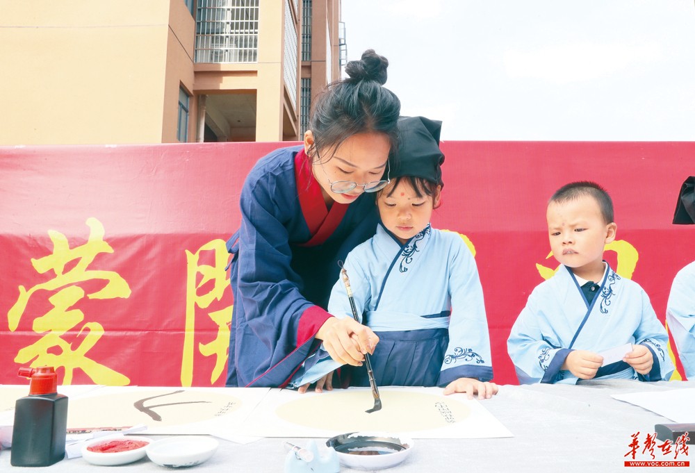 9月27日,小朋友在老师帮助下书写“人”字,破笔开蒙。当天,新田县喜洋洋幼儿园举行国学传统“开蒙礼”。新入学的幼儿在家长的陪伴下参加正衣冠、行拜师礼、朱砂启智、破笔开蒙等仪式,感受传承中华传统文化。