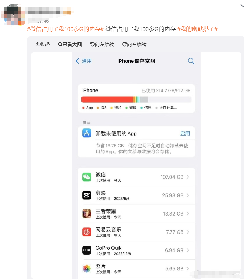 有网友晒出自己512G的手机中,微信占用了107G的储存空间,引起网友广泛关注。