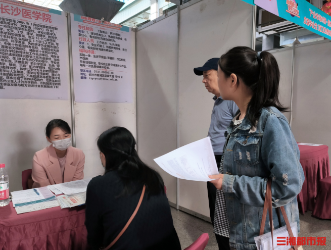 在南华大学附属第七医院招聘岗位前围满了不少求职者。“消化专业要吗?”一名求职者来到该展位前询问,工作人员热情的接待,和她聊相关岗位情况。一番交谈后,双方都比较满意。这名求职者告诉记者,她姓邱,是湖南师范大学2023届硕士毕业生。“我毕业后考了三甲医院的行政编,但考虑到之后的发展,还是想从前技术岗。”小邱告诉记者,虽然行政岗相对稳定但可替代性太强,加之自己本身学习的这块,还是想在技术领域有所精进,所以这次来了解下技术岗的招聘情况,和招聘方也沟通了胃镜师这一岗位。