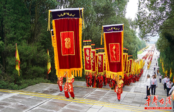 秋分时节,炎帝陵一派庄严气氛。阙门广场上,彩旗招展,迎宾鼓号队员、腰鼓队员敲起欢快的鼓点,迎接四方宾客;由幡旗、龙狮、鼓号、供品等组成的仪仗队伍整齐列队,整装待发。