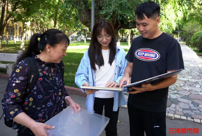 (9月7日,新疆医科大学校园里,湖南哥哥范尉和新疆妹妹王凯雪聊起过去。)