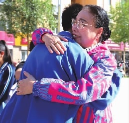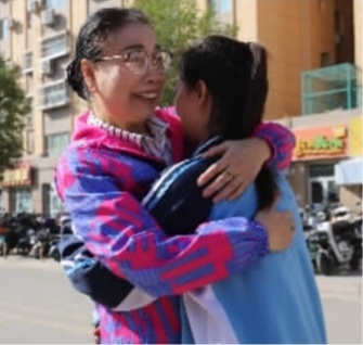 “钟奶奶,我好想你呀!”近日,在吐鲁番市高昌区第二中学校门口,远远看到钟大蔚的麦合丽娅·艾合买提和玉素甫艾力·黑米提一眼就认出了她,激动地冲上去紧紧与其拥抱在一起,并郑重地为其戴上维吾尔族的花帽和丝巾。这份热情和默契,让人很难相信,这是他们3个人的第一次见面。