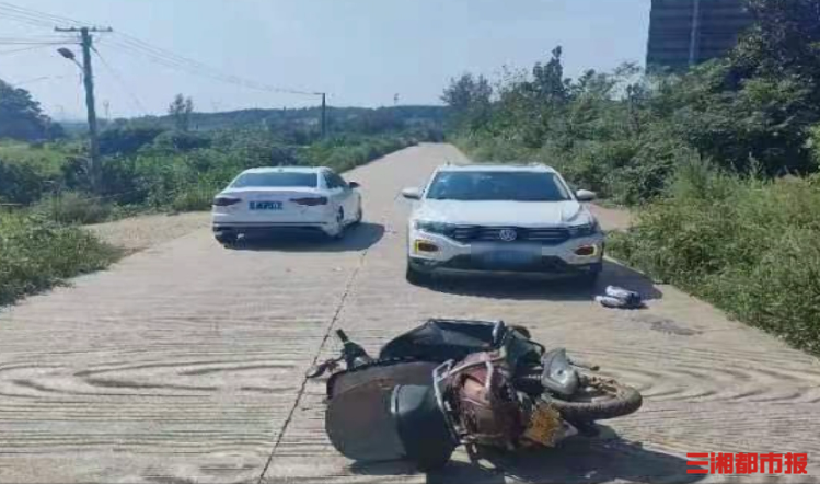 岳阳县交警大队民警接警后赶到事故现场,发现白色越野车停在路口,前方地上倒着一台电动车,电动车驾驶人魏某受伤倒地,民警立即联系120急救人员赶到现场救助。