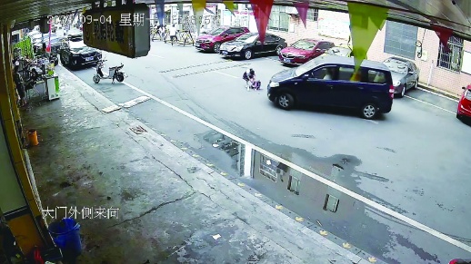9月4日下午,小女孩正蹲在马路中间翻书包,一辆面包车正转向她开来。