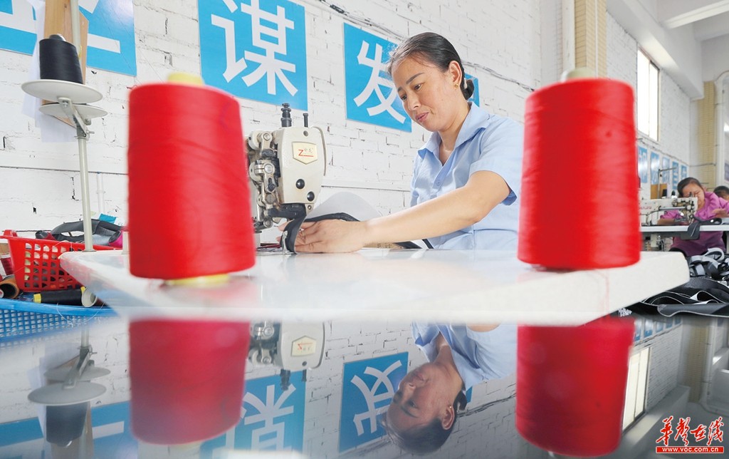 8月31日,祁东县灵官镇易地搬迁集中安置点,村民在乡村车间工作。近年来,该镇通过平台化运营、市场化招商和精细化服务等措施,在易地搬迁集中安置点建设了多个乡村车间和特色中药材种植基地,促进劳动力就近就地就业。