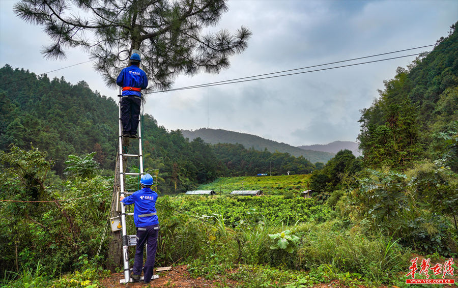 (电信工作人员正在测试茶园5G信号,为“村播”护航。彭福宗摄)