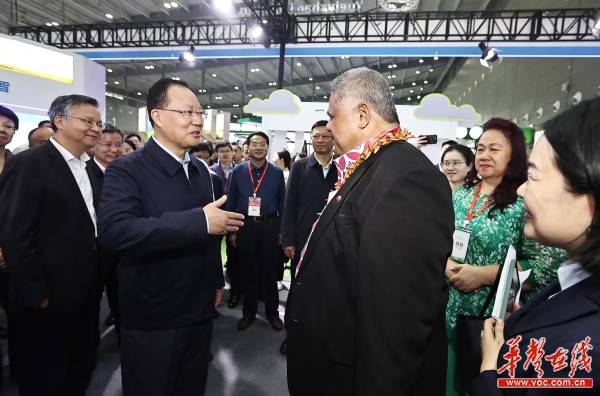 △毛伟明与前来参展的萨摩亚农渔业部部长拉乌利交流