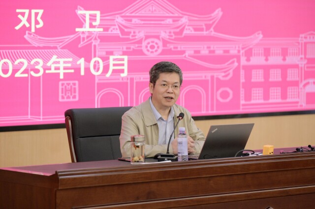 邓卫首先从“两个结合”的内涵入手,阐明了“两个结合”的本质和内在逻辑。通过回顾“两个结合”提出和发展脉络,邓卫指出,“两个结合”是马克思主义中国化时代化百年演进的经验总结,贯穿党的历史全过程。邓卫向学生们讲述了2020年习近平总书记来校考察的场景,重温了总书记的重要讲话精神,指出岳麓书院是党的实事求是思想路线策源地,也是“两个结合”形成的先声地。
