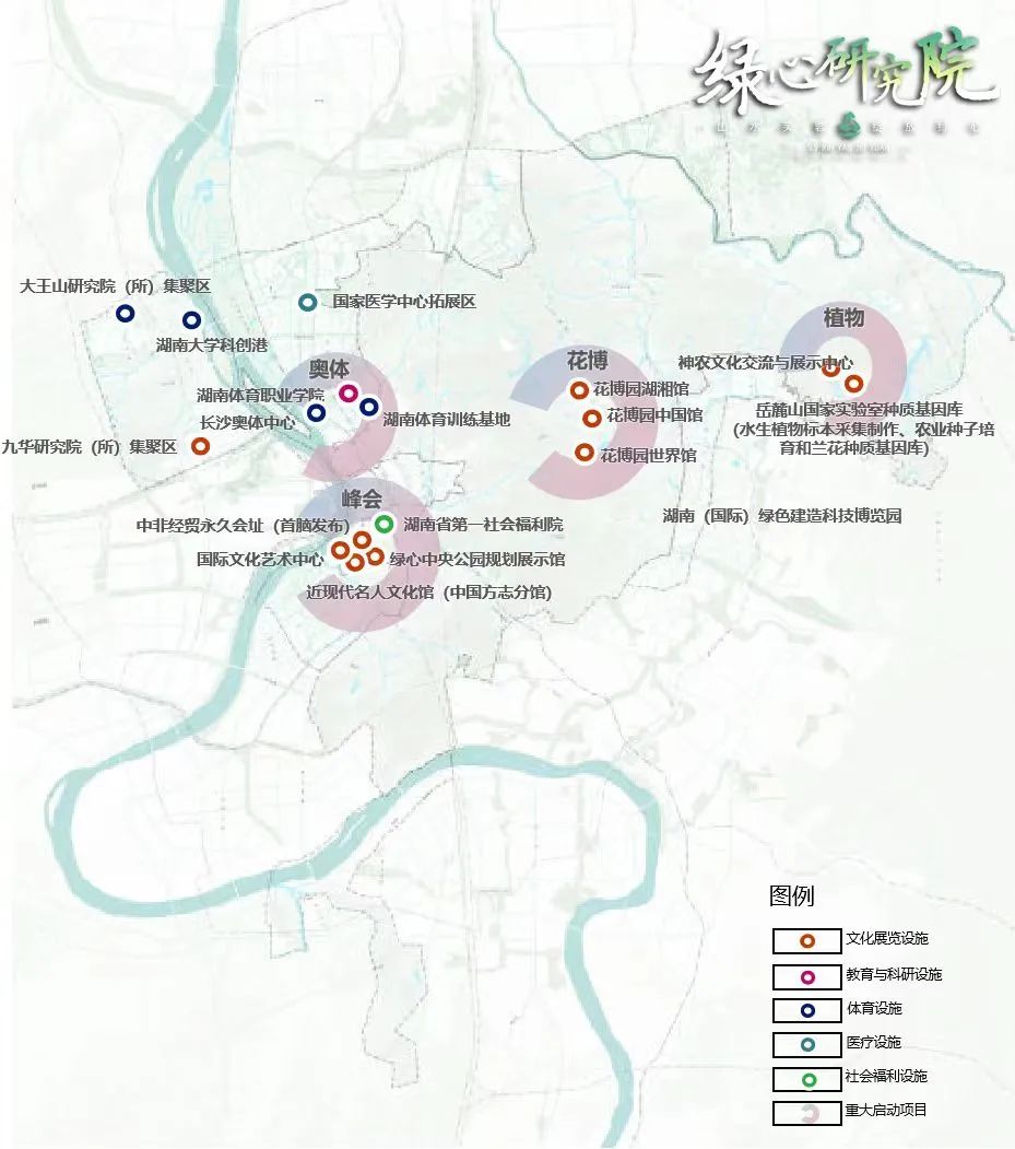 国际文化艺术中心、中非经贸永久会址(首脑发布)、近现代名人文化馆(中国方志分馆)、绿心中央公园规划展示馆、湖南省第一社会福利院