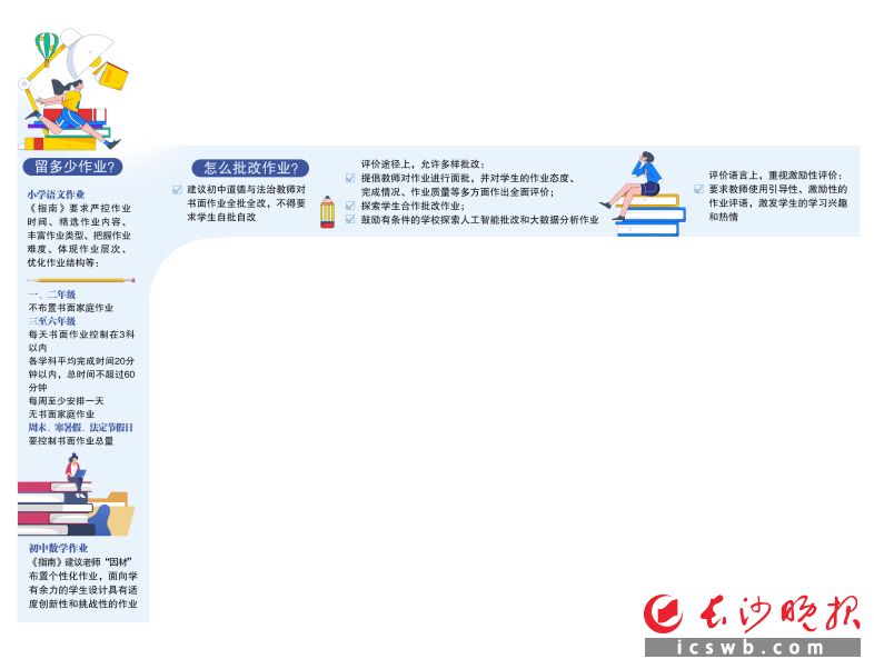 记者获悉,此次省教育厅组织研制了小学语文、数学、英语、科学等4个学科和初中语文、数学、英语、道德与法治、历史、地理、物理、化学、生物学9个学科的作业设计《指南》。
