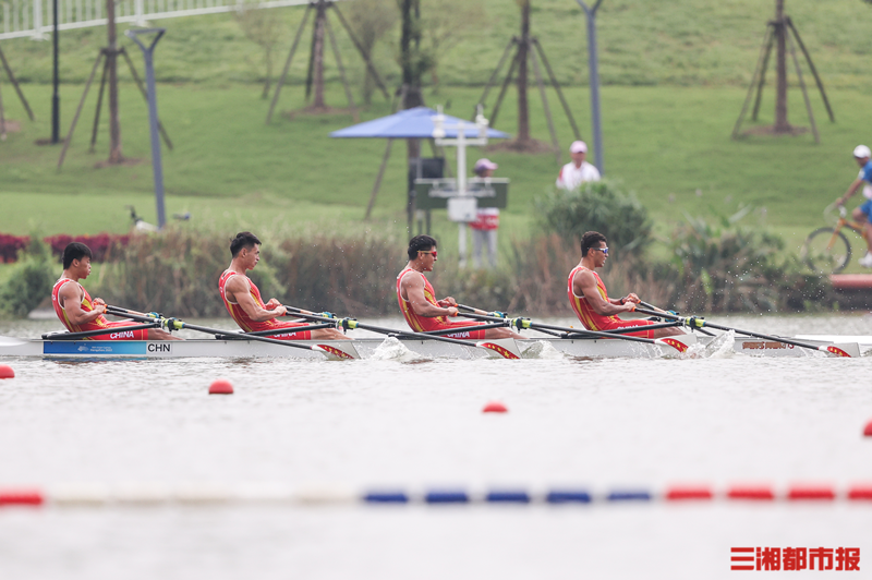 (9月25日,湖南运动员伊绪帝(左二)杭州亚运会赛艇男子四人双桨决赛中摘金。亚运会官方图)