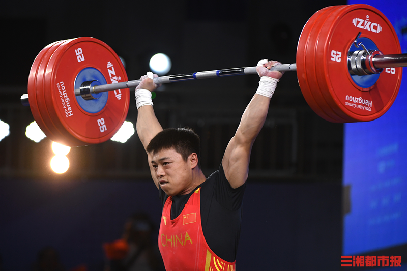 (10月1日,益阳小伙谌利军在男子举重67公斤级比赛中。亚运会官方图)