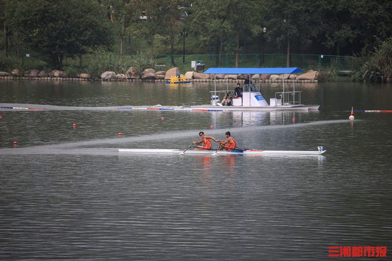 (9月24日,湖南老将张亮和国家队搭档刘治宇夺得赛艇男子双人双桨金牌。记者 刘丰 摄)
