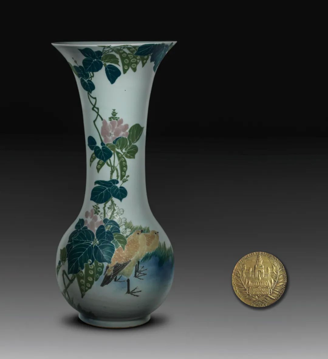 1915年荣获巴拿马万国博览会金奖的醴陵釉下五彩“扁豆双禽瓶”。资料图片