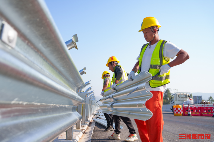 11月28日,在衡永高速公路永州市冷水滩区段施工现场,施工人员正在进行护栏安装和树木移栽等工作。衡永高速路面一标二分部生产副经理杨尚锦介绍,目前,衡永高速公路主体工程基本完成,已全面进入扫尾阶段。服务区、收费站、护栏、绿化等扫尾工程在年底完工,明年将进行道路标志标线施划等工作,确保如期实现顺利通车目标。