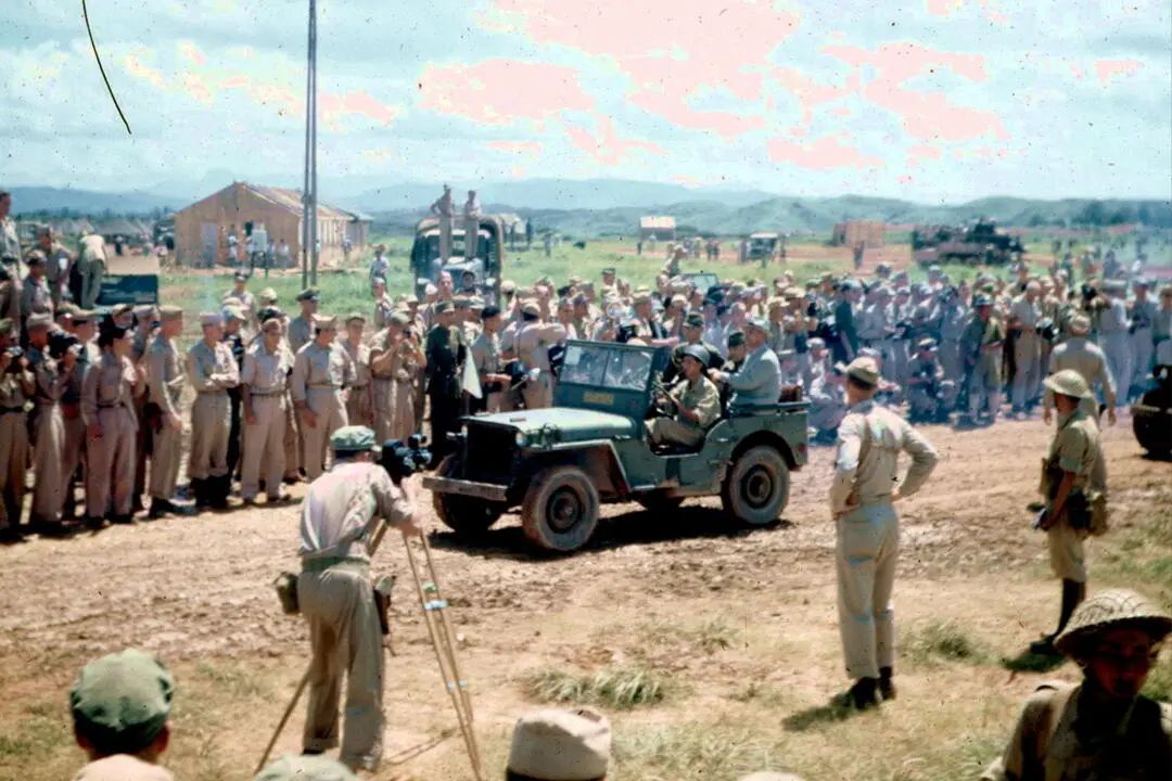 约瑟·夫德捐赠的1945年8月21日日本投降代表乘坐的插有白旗的降车彩色照片。