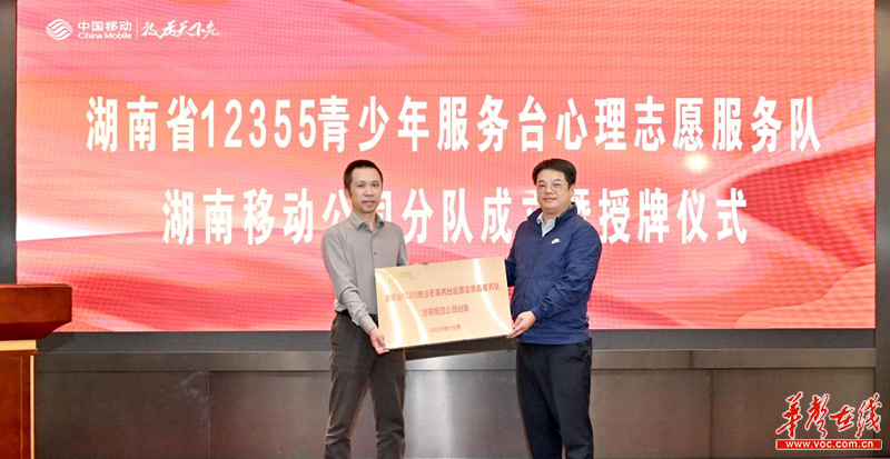 华声在线11月10日讯(通讯员 陈凡军 唐嗣富)青少年是国家的未来,他们的成长和发展需要得到全社会的关注和支持。11月9日下午,湖南省12355青少年服务台心理志愿服务队湖南移动分队成立授牌仪式在长沙举行,湖南移动将凝聚力量,为青少年的心理健康保驾护航。