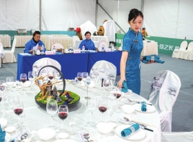 参赛选手(右一)在进行餐厅服务项目的比拼。