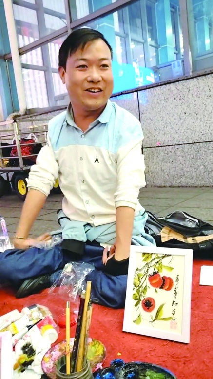 冬日,长沙五一广场和橘子洲人流量大的角落,不少网友会偶遇到一位残疾小哥趴坐在地上,靠着简易的作画工具,一边灵活用嘴咬住画笔调色,一边靠仅能动的3根手指在画纸上飞速地描摹,不到十分钟,就能根据顾客需求完成一幅画作。