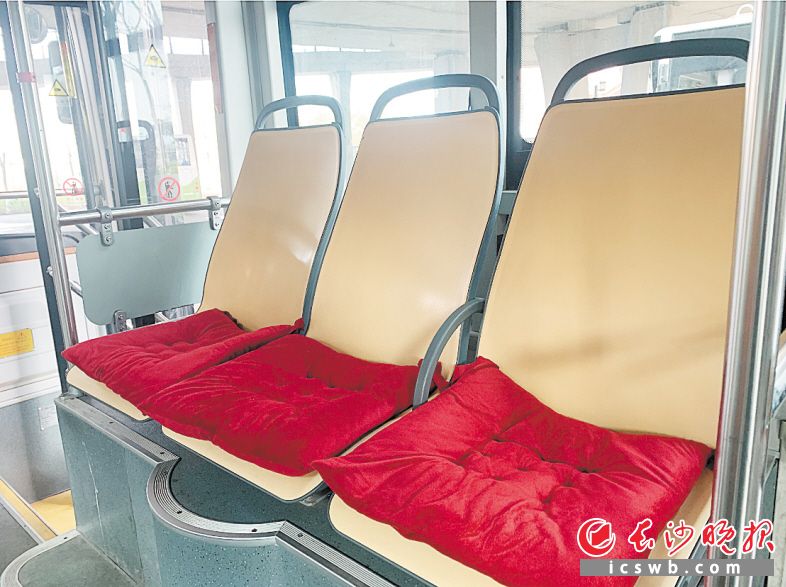 记者看到,在这辆公交车上,每一个座位上都有一个玫瑰红的棉坐垫,记者感受了一番,坐垫很柔软,有了这个坐垫后,确实温暖多了。