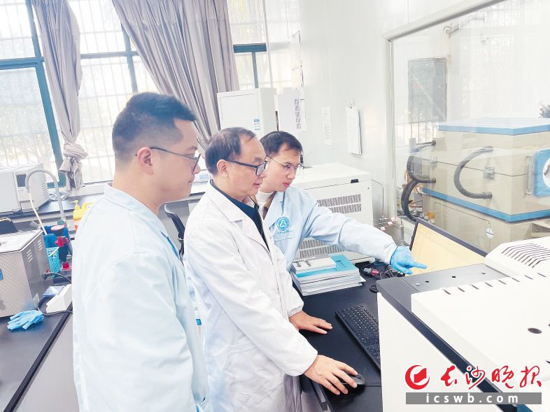 中南大学教授、实验室主任刘又年(中)和团队成员查看实验数据。长沙晚报通讯员 吴淋琳 摄