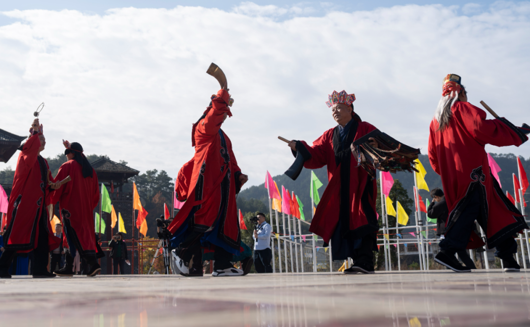 大熊山脚下,走进蚩尤屋场,傩师身着传统巫服、头戴傩面、手持法器、脚迈“七星步”,配以独特的表演,烘托出神秘的氛围。