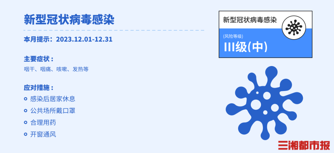 华声在线12月1日讯(全媒体记者李琪 通讯员罗垲炜)记者今日从湖南省疾控中心了解到,根据该中心发布的12月疾病风险综合预报及防疫指数,我省12月防疫指数为Ⅱ级(较高),市民需重点关注流行性感冒、肺炎支原体感染、诺如病毒感染、新型冠状病毒感染。(注:Ⅰ、Ⅱ、Ⅲ、Ⅳ分别指流行风险等级为高、较高、中、低。)