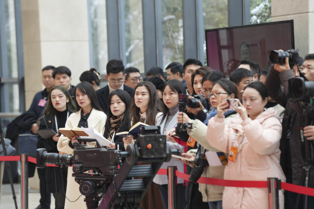△1月24日,记者在“厅长通道”采访。各媒体记者穿梭于会议现场,斟字酌句采写新闻,“长枪短炮”定格精彩,只为更好呈现两会盛况。华声在线全媒体记者 辜鹏博 摄