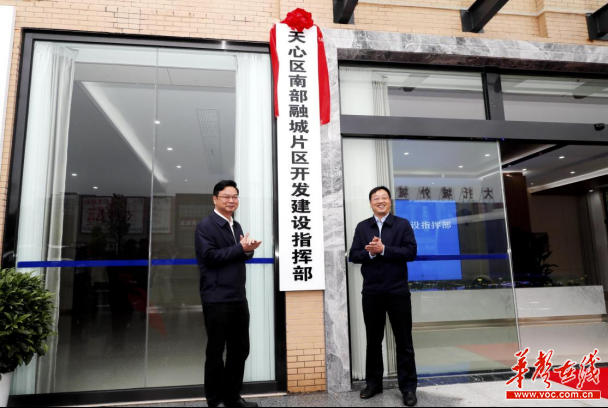 天心区委书记吴新伟、区委副书记、区长周志军为区南部融城片区指挥部揭牌。