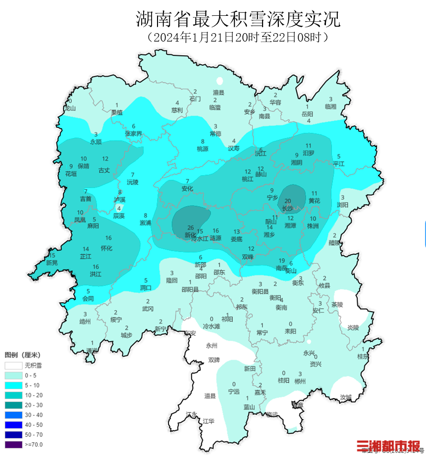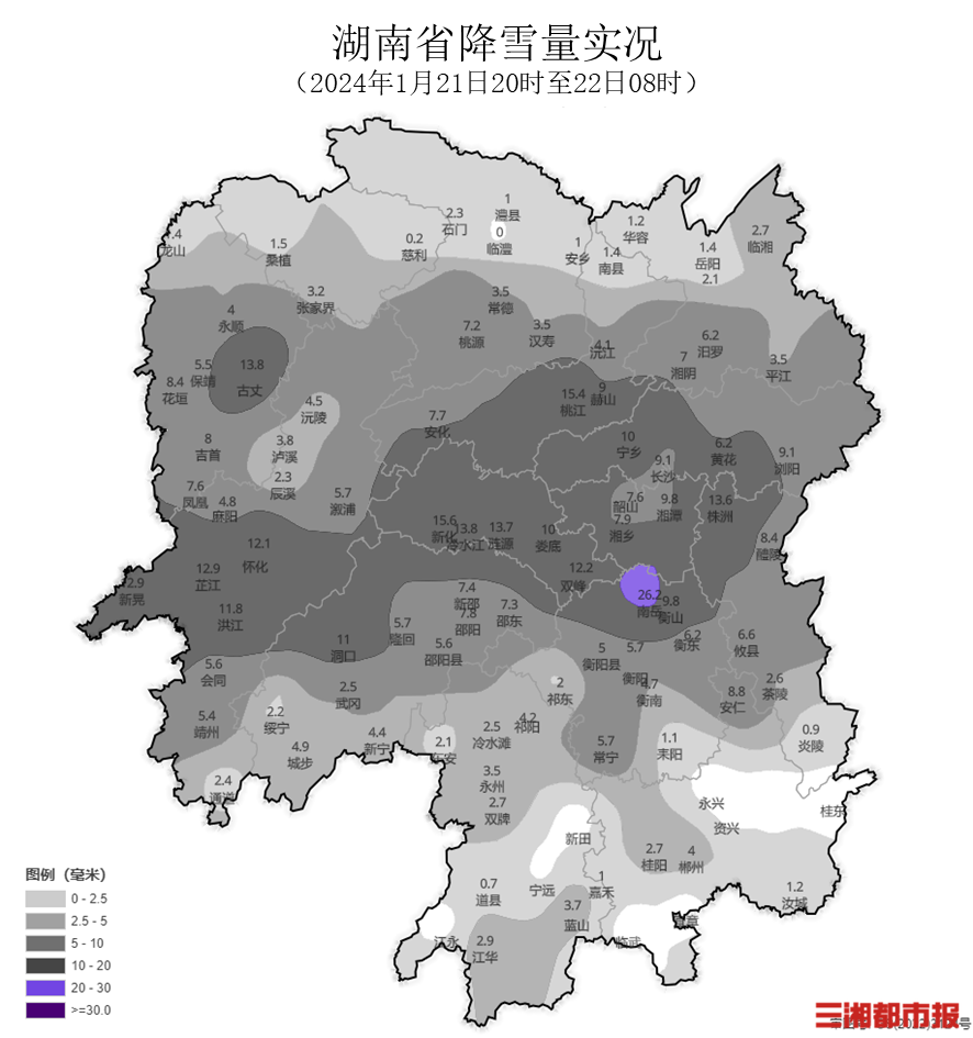 华声在线1月22日讯(全媒体见习记者 李致远 通讯员 廖媛)从1月21日到22日晨,从贵州到湖南出现大范围降雪,湖南部分地区出现暴雪。22日晨8时积雪,长沙城区16厘米,长沙莲花20厘米。22日白天,长沙强度逐渐减弱;22日晚-23日,多云或晴天。