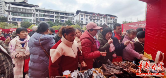 年货节现场热闹非凡,全县15家优质供应商参展,自然纯正的蜂蜜、风味独特的腊制品、天然健康的山茶油、健康清新的茶叶、精美的手工竹制品等百余种绥宁本土特色年货琳琅满目,令人目不暇接。现场还推出消费券优惠购、免费送春联、猜灯谜送礼、试吃品鉴、打卡有礼等活动,让市民感受传统民俗魅力的同时,助燃年货消费。“茶叶味道清新,很适合过年招待客人。腊肉味道也不错,‘柴火味’很足,打算买回去给家人、朋友尝尝。”老家在郴州的王先生早早来到现场采购年货。