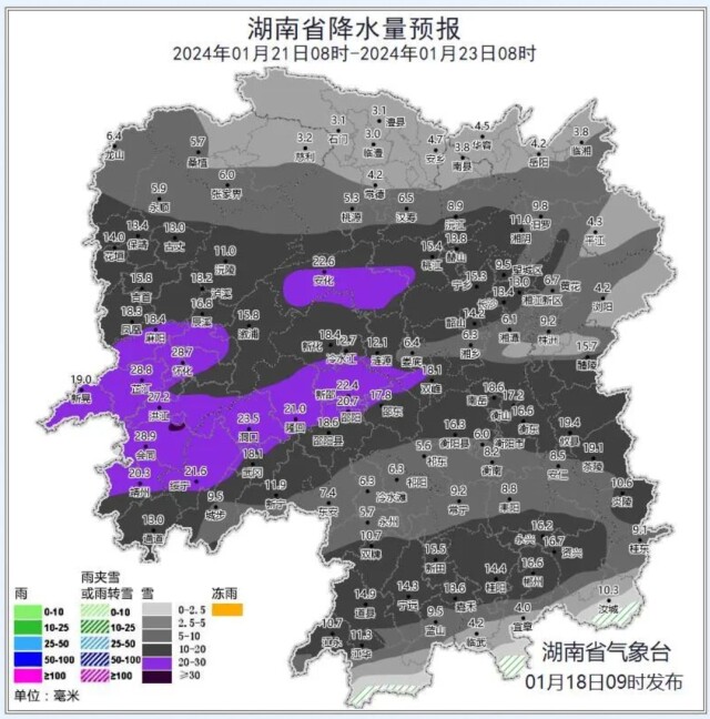 △湖南省1月21日8时至23日8时累计降雪(雨)量预报图。