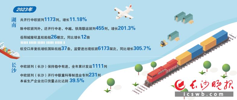 2023年来,长沙还新开行中老铁路国际进口班列;新开辟经同江口岸出境俄线班列;俄线明星班列开行量全国第一,成为湖南与“一带一路”共建国家经贸往来的重要载体。