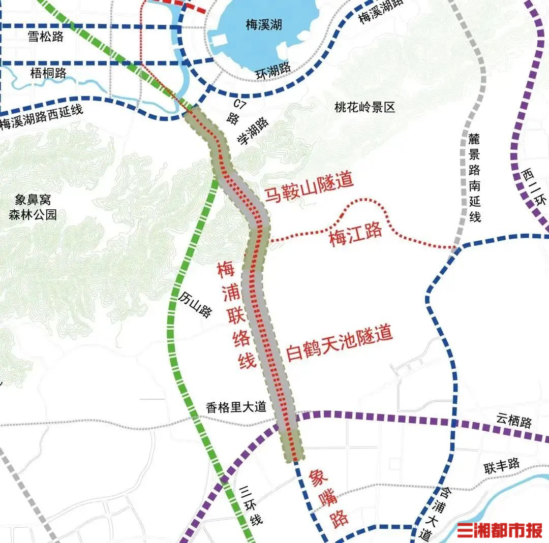 目前正在建设的梅浦联络线南段长约3.71千米,隧道占比近70%,分别是马鞍山隧道及白鹤天池隧道。改路段北接已建成的梅浦联络线北段,向南延伸与梅江路相交,设置隧道穿越桃花岭景区及白鹤天池山体,以及香格里大道和云栖路,至于含浦片区的象嘴路。