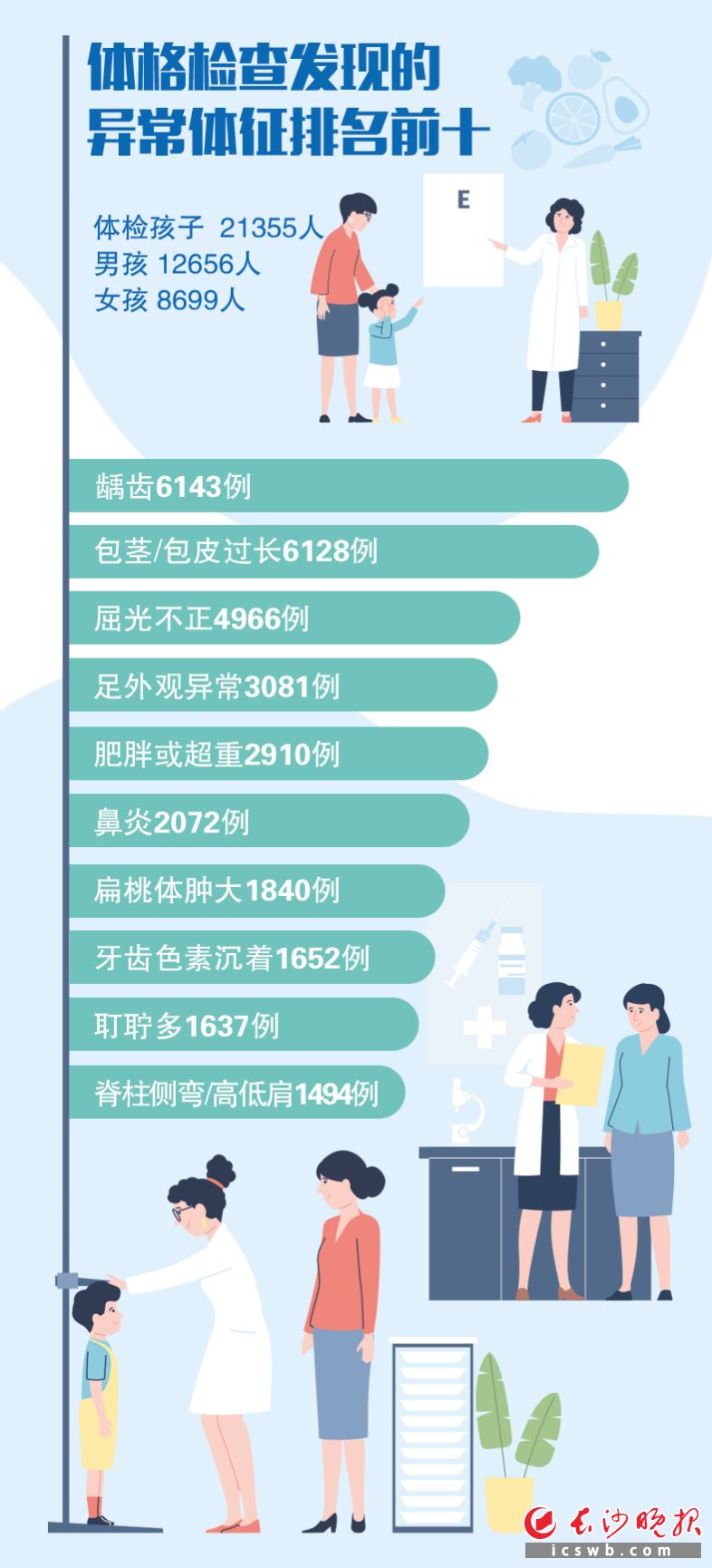 数据显示,体检的21355名孩子中,男孩12656人、女孩8699人,男女比例约为3:2。