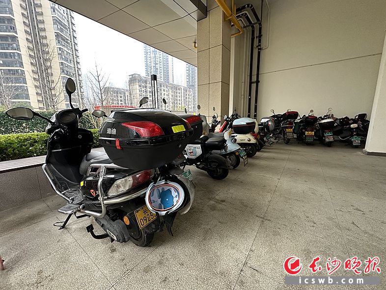 在劳动东路某小区内,超高层住宅楼架空层停放了不少电动自行车。长沙晚报全媒体记者 刘琦 摄