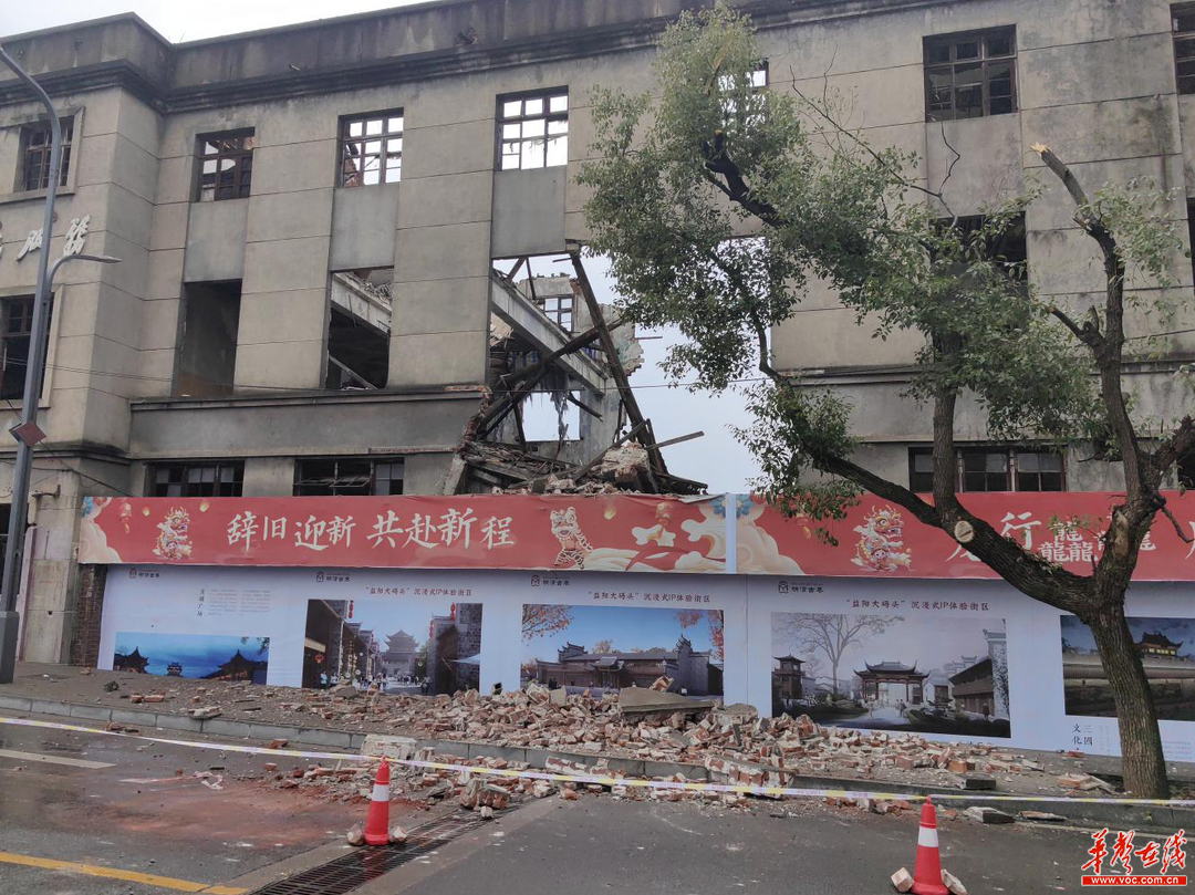 2月21日凌晨5点左右,大码头街道巡查人员徐万峰和石码头社区巡查人员赵进在三益街与资江西路交汇处南侧发现原百货大楼(该百货大楼属文物保护建筑,楼内无人)部分外墙摇摇欲坠,存在倒塌迹象,马上报告街道办事处。接报信息,办事处迅速组织力量赶赴现场,发现百货大楼二楼中间大梁出现断裂,部分建筑物脱落,在保证安全的情况下,对垮塌区域及临近建筑划定警示范围,树立警示标识,同时上报资阳区应急指挥部办公室。