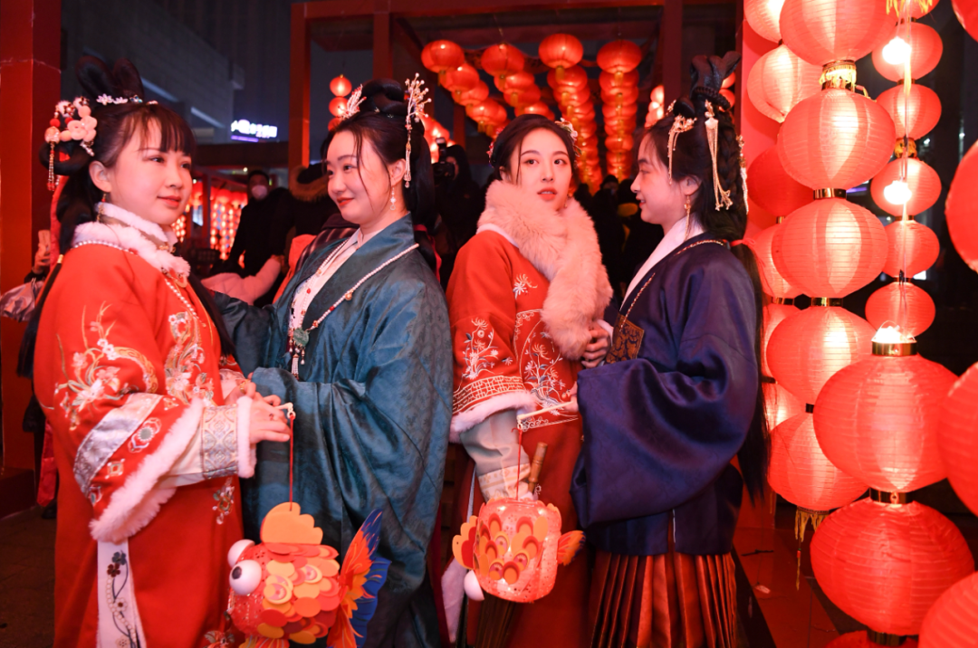 2月5日晚,株洲市天元区神农城,市民身着古装逛花灯展。湖南日报全媒体记者 辜鹏博 张咪 摄