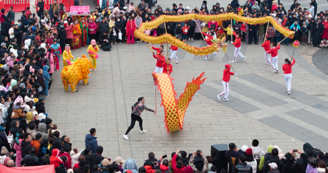 2月22日,长沙县㮾梨街道陶公庙前坪,游客观看舞龙表演。湖南日报全媒体记者 辜鹏博 摄