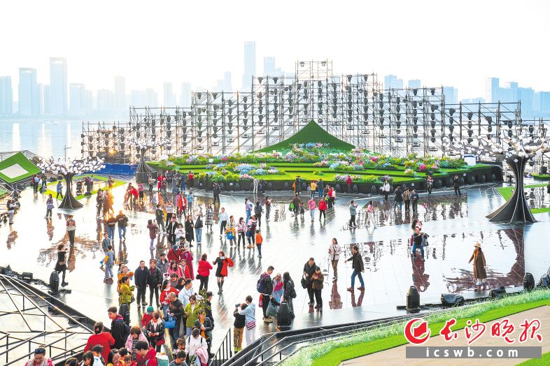 (正月初八是春晚长沙分会场舞台对外开放的最后一天,游客纷纷来到位于滨江文化园的舞台打卡拍照。长沙晚报全媒体记者 邹麟 摄)