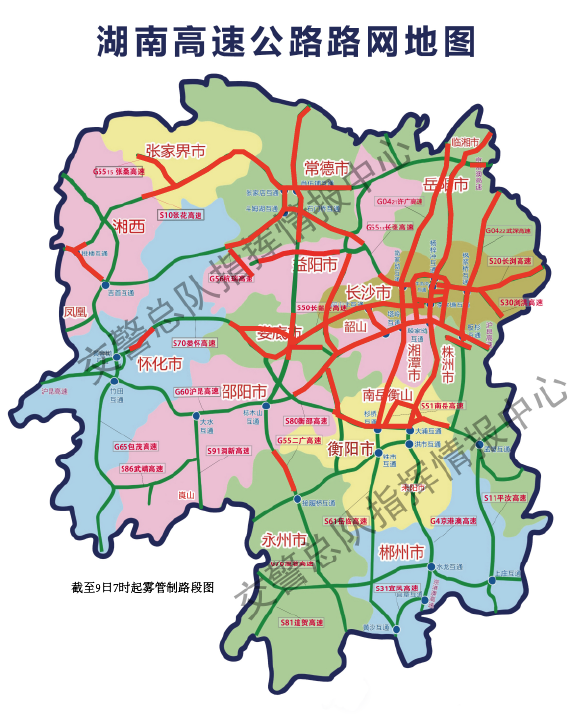 2月8日22时59分许起,衡阳、株洲、长沙、湘潭、益阳、岳阳、怀化、湘西、娄底、张家界、常德、永州、邵阳13个支队辖区先后开始起雾,30条高速公路通行受到影响,临时交通管制262个收费站。预计从9日早上8时起,各地将根据雾情情况逐步解除交通管制。具体管制情况如下: