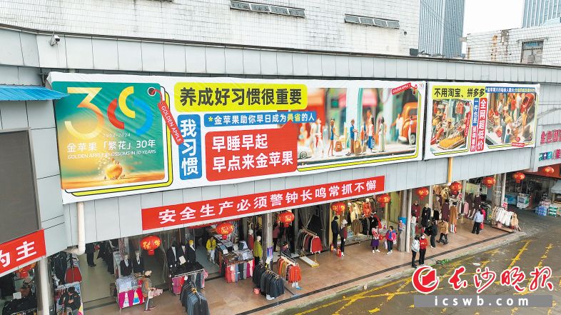 金苹果大市场1994年开业,至今已有30年。市场经营服装、鞋帽、小百货、箱包、皮革制品等,铺面近3000个,营业面积近5万平方米。上个世纪末,这里不仅是长沙人购物的热门去处,还是流行时尚的风向标。老长沙人回忆,当时的金苹果大市场就如同今年开年电视剧《繁花》里的南京路一般热闹。