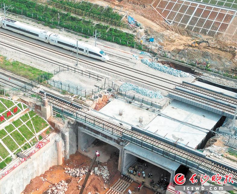 金岭路立交工程下穿长株潭城际铁路项目上方,列车飞驰而过。 中铁二十五局供图