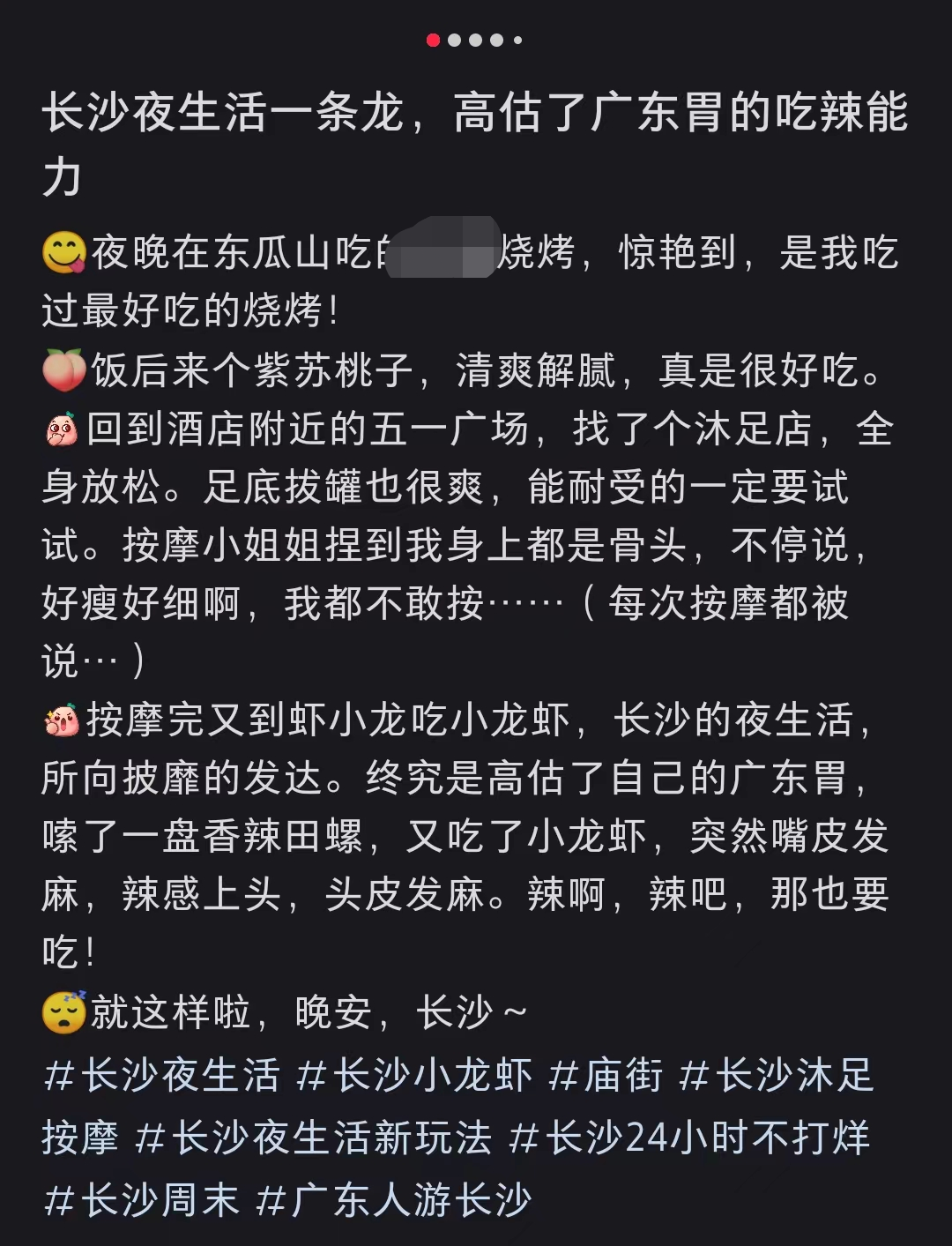 来到活力十足的长沙,怎么能不体验发达的夜生活!桌游、剧本杀、密室逃脱、KTV、麻将、夜宵、洗脚……会玩的广东网友早就安排了长沙夜生活一条龙——夜市烧烤、足浴按摩、小龙虾夜宵……