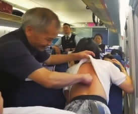 当天18时50分,乘务员播放的一起“紧急求助”,打破了车厢内的宁静。中南大学湘雅医院原高压氧科主任肖平田听到紧急呼救后,快速穿过五个车厢,第一时间赶到患者身边。到达现场后,肖平田迅速判断出患者正在发烧,并立即采用刮痧疗法进行治疗。通过5—10分钟的治疗后,患者的症状明显好转,身体逐渐恢复正常。