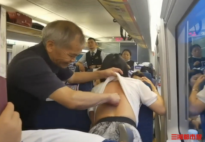 当天18时50分,乘务员播放的一起“紧急求助”,打破了车厢内的宁静。中南大学湘雅医院原高压氧科主任肖平田听到紧急呼救后,快速穿过五个车厢,第一时间赶到患者身边。