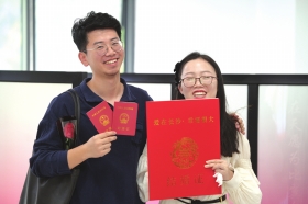 5月20日,长沙雨花区民政局婚姻登记中心,一对新人展示他们的结婚证。组图/记者吴琳红