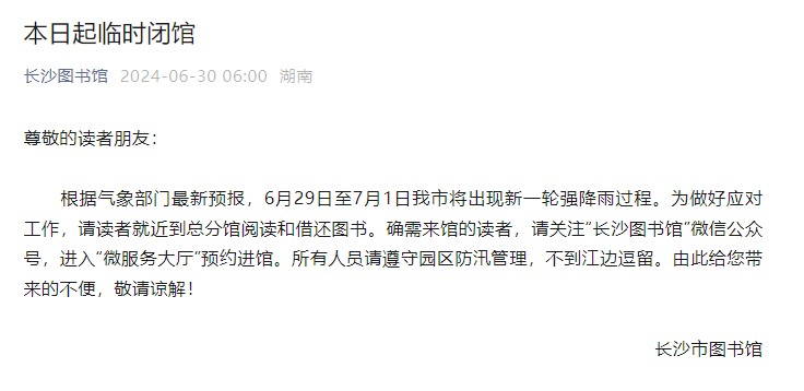 通知称,根据气象部门最新预报,6月29日至7月1日长沙市将出现新一轮强降雨过程。为做好应对工作,请读者就近到总分馆阅读和借还图书。确需来馆的读者,请关注“长沙图书馆”微信公众号,进入“微服务大厅”预约进馆。所有人员请遵守园区防汛管理,不到江边逗留。