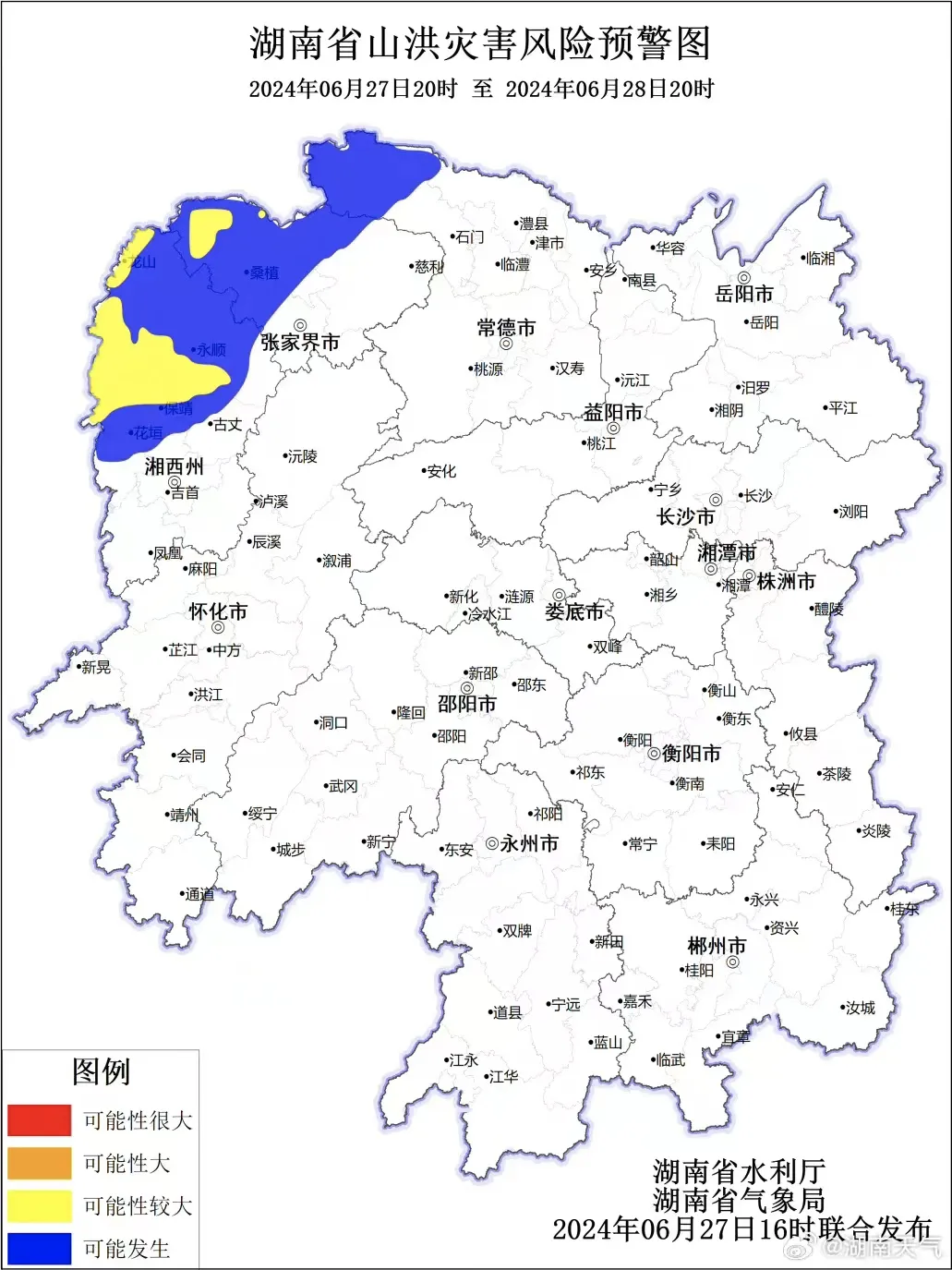根据地质灾害成灾规律和孕灾条件,结合2024年6月27日短期气象预报情况,省自然资源厅与省气象局联合会商得出如下结论:自6月27日20:00至28日20:00,受降雨影响,湘西北部分区域发生突发性地质灾害风险高(橙色预警),湘东北、湘西北大部分区域发生突发性地质灾害风险较高(黄色预警)。