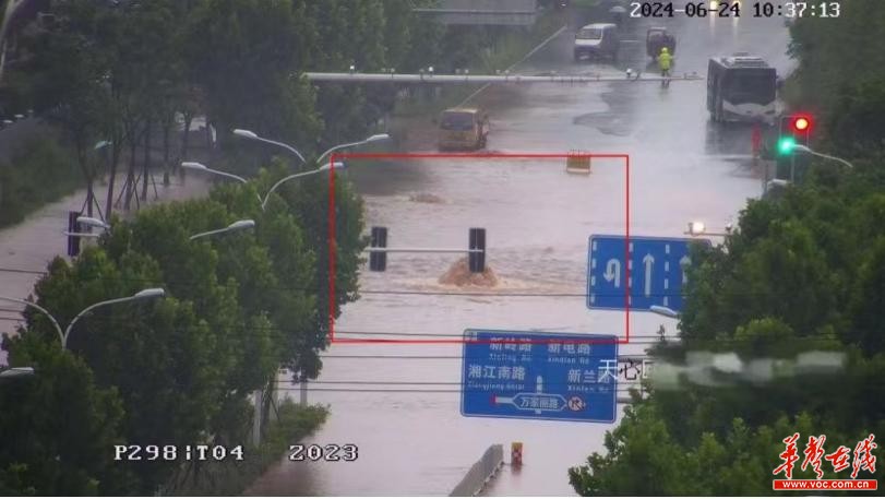 (“铁塔哨兵”系统监测长沙市天心区某路段严重积水,影响交通出行。 通讯员供图)